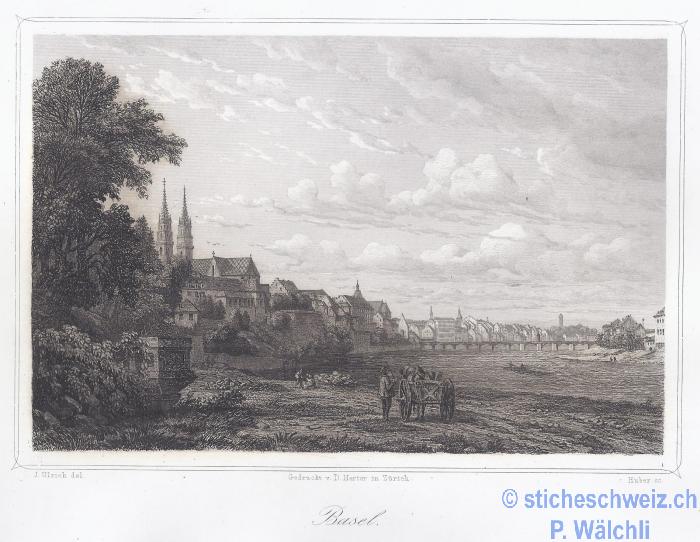Basel: Münster + Rheinbrücke in Basel ,Litho 1861 |