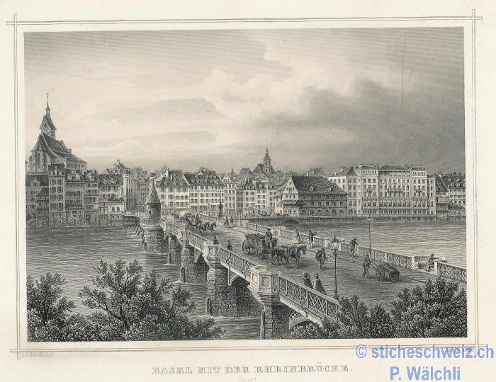 Basel: Ansicht der Rhein Brücke zu Basel,Litho 1861 |