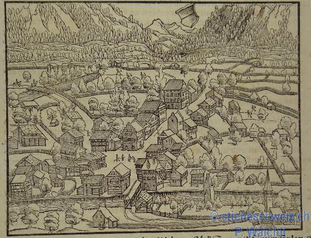 Sarnen Vogelansicht Münster , Holzschn.1550 |
